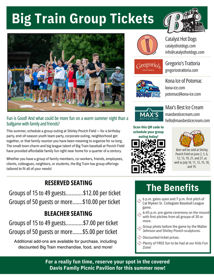 Thank you so much for filling out the "Picnics & Parties Interest Form." A member of our amazing Big Train team will be reaching out within the next few days. Please be on the lookout for a response from an email address from the domain: "@bigtrain.org." We can't wait to see you out at the ballpark!
